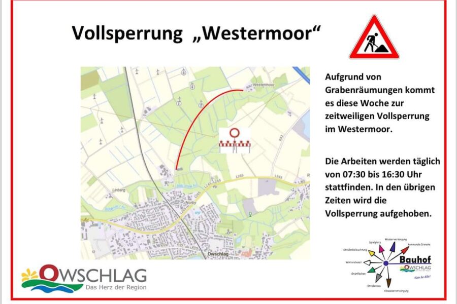 aktuellAllgemein Die BfO informiert: Vollsperrung „Westermoor“ vom 06.02-09.02 tagsüber wegen Grabenräumungen Auf Grund von Grabenräumungen kommt es in der Zeit von Dienstag, den 06.02.2024 - Freitag,…Michael Brandt6. Februar 2024