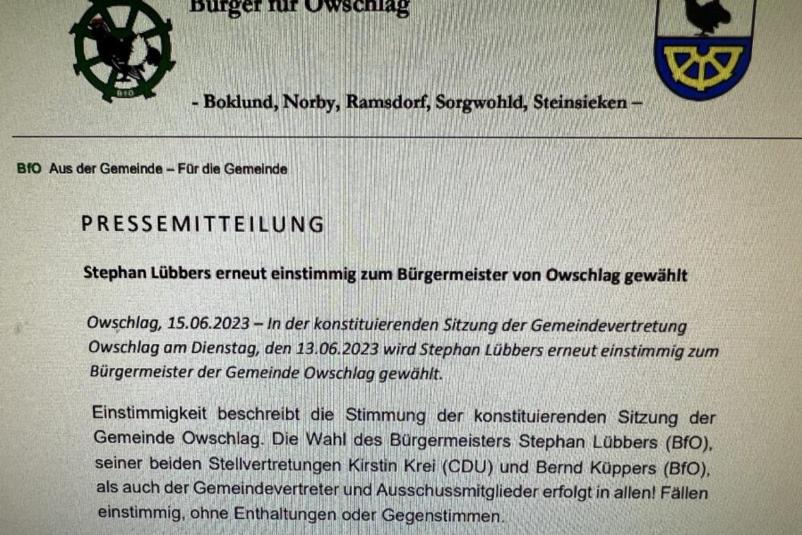 aktuellAllgemein Stephan Lübbers erneut einstimmig zum Bürgermeister der Gemeinde Owschlag gewählt In der konstituierenden Sitzung der Gemeindevertretung Owschlag am Dienstag, den 13.06.2023 wird Stephan Lübbers erneut…Michael Brandt15. Juni 2023
