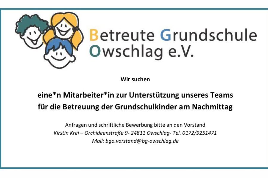aktuellAllgemein Die BfO informiert: Betreute Grundschule Owschlag e.V. sucht Verstärkung Die Gemeinde Owschlag: Für die Betreute Grundschule Owschlag (BGO) wird ein*e Mitarbeiter*in zur Betreuung der…Michael Brandt12. Juli 2023