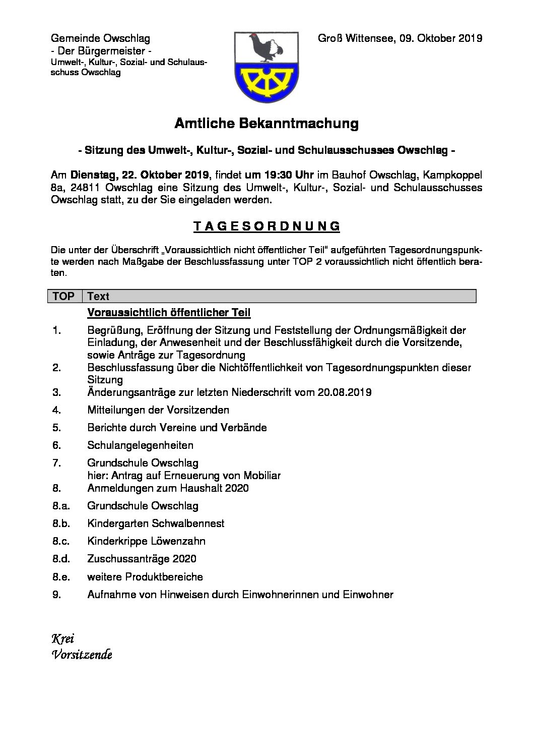 22. Oktober 2019 @ 19:30 Umwelt- Kultur- Schul- und Sozialausschuss -Haushalt Bauhof Owschlag Kampkoppel 8a, Owschlag